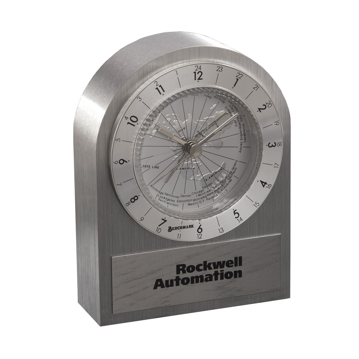Keep the world within reach with this beautiful; brushed silver arch clock! Featuring a classic; sleek design; this clock has the ability to tell you the time in several international cities. Never make an accidental 3 AM call to overseas again! Perfect for desk or travel. Battery is included.