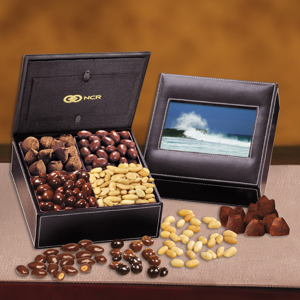 This faux leather photo frame box holds a 4" x 6" photo in the lid and has lots of storage space inside for keeping small office items close at hand. It's packed full of gourmet confections everyone will be thrilled to receive... smooth Milk and Dark Chocolate Covered Almonds, creamy Cocoa Dusted Truffles, and Fresh Roasted Virginia Peanuts. Nearly one and a quarter-pounds of gourmet treats! We include a generic seascape photo that recipients can easily replace with one of their own. If you prefer to send 4" x 6" inserts, you may do so; contact factory for details. Your logo, foil-stamped in gold on the inside cover, will be a subtle reminder of this terrific gift.
