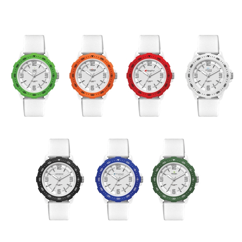 This active style watch is sure to please. 40mm plastic case with choice of color rotating bezel and white silicone rubber band. High precision Japanese movement,water resistant to 1ATM